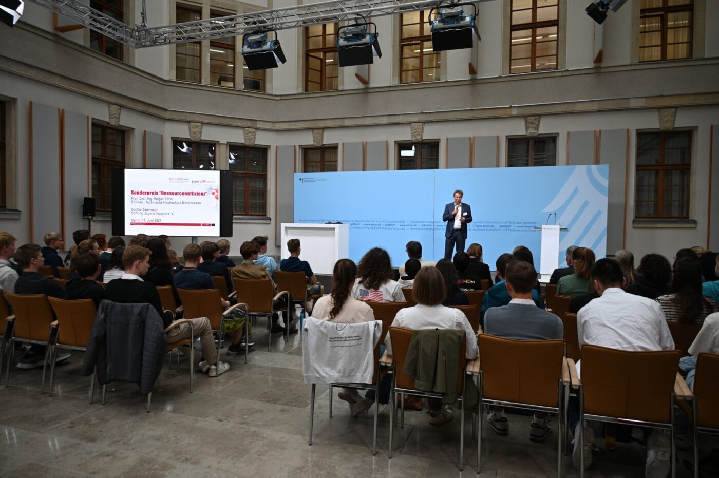 In the last two rounds of Germany's best-known competition for young researchers at state or national level, the participating young researchers were honoured with the prize sponsored by the Federal Minister for the Environment for their work on the topic of "resource efficiency". Their research projects dealt in a special way with specific issues of resource efficiency or resource conservation and made a clear contribution in this area. The aim of the special prize is to recognise the outstanding achievements of young talents in mathematics, IT, natural sciences and technology (STEM) in the field of resource efficiency. It also aims to encourage them to engage with sustainable, climate-friendly and future-proof technologies and to get them interested in a field of research and work that is in demand worldwide.