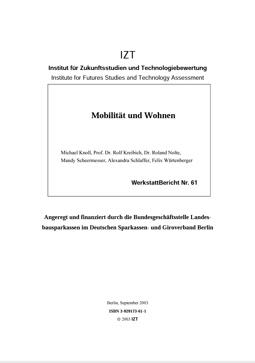 Mobility and housing Authors Knoll, Michael; Kreibich, Rolf; Nolte, Roland; Scheermesser, Mandy; Schlaffer, Alexandra; Würtenberger, Felix Source information Title Mobility and housing WorkshopReport Volume 61 Year of publication2003 Document typeBook Monograph