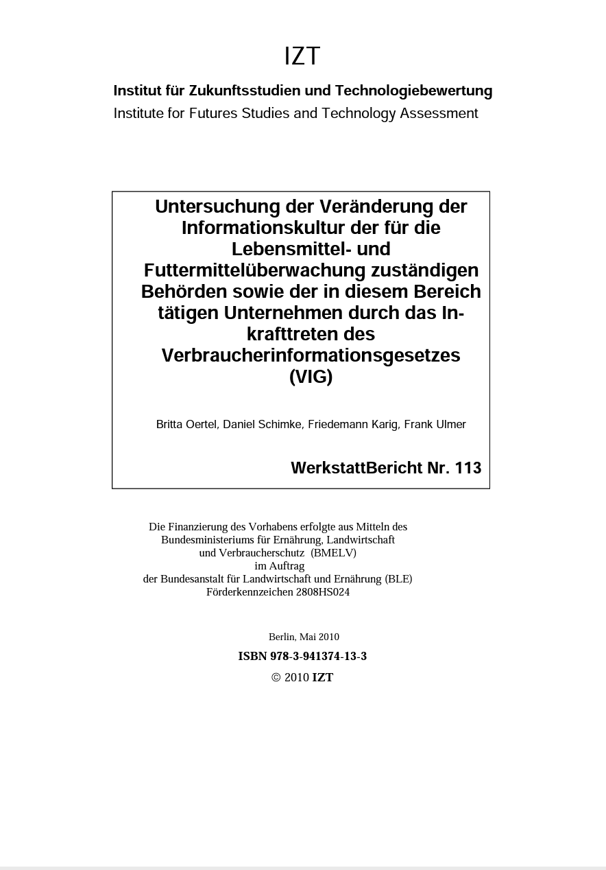 Untersuchung der Veränderung der Informationskultur der für die Lebensmittel- und Futtermittelüberwachung zuständigen Behörden sowie der in diesem Bereich tätigen Unternehmen durch das Inkrafttreten des Verbraucherinformationsgesetzes (VIG)