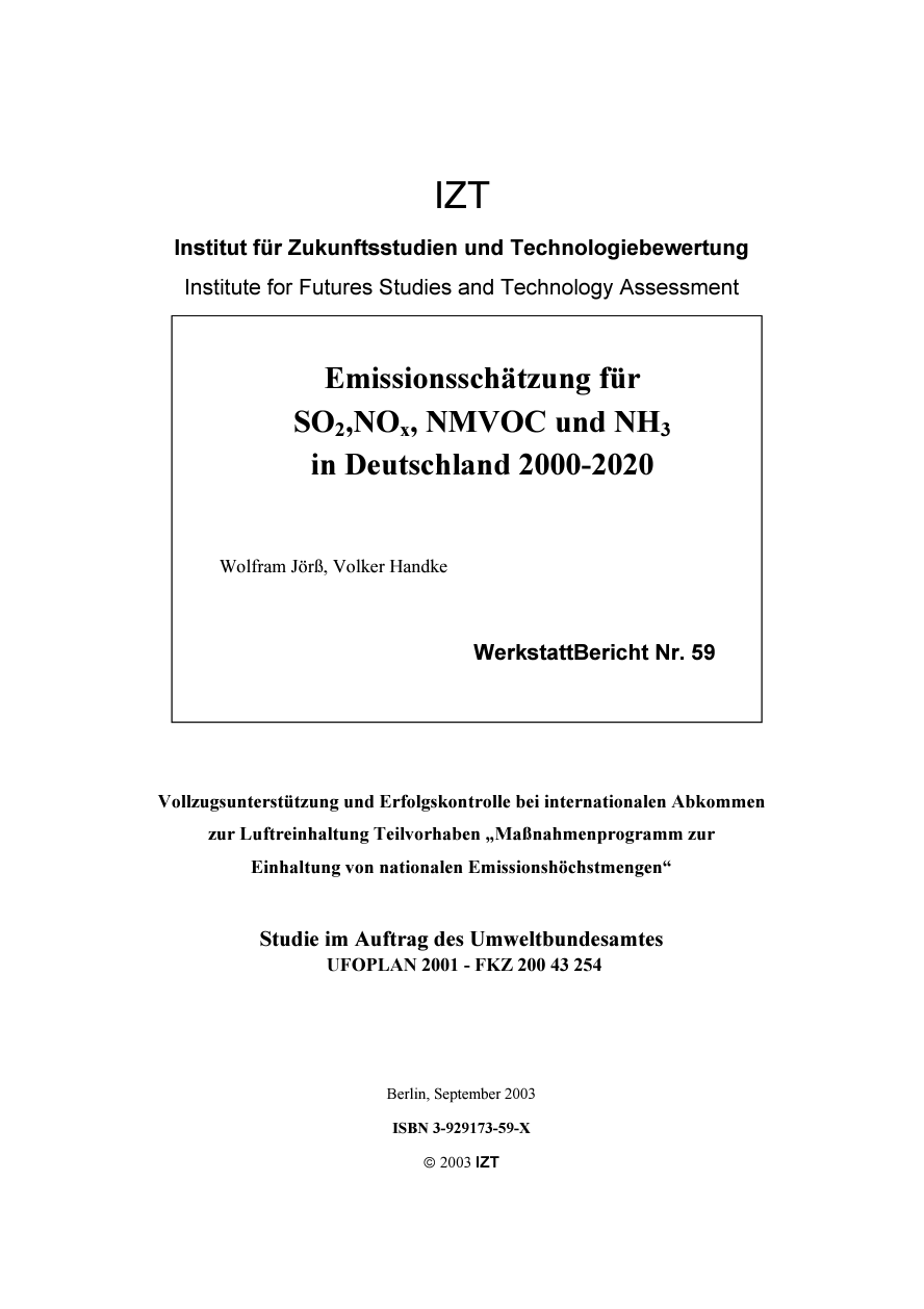 Für die Emissionen an Schwefeldioxid (SO2), Stickoxiden (NOx), flüchtigen Kohlenwasserstoffen außer Methan (NMVOC) und Ammoniak (NH3) werden Emissionsprognosen für die Jahre 2005, 2010, 2015 und 2020 sowie eine Referenz für 2000 erarbeitet. Hierzu wurden für die relevanten Quellgruppen stationäre Feuerungsanlagen, Verkehr, Verteilung von Kraftstoffen, Verwendung von Lösemitteln, Landwirtschaft sowie industrielle Prozessemissionen die aktuellsten dem Umweltbundesamt verfügbaren Daten und Annahmen zu emissionsverursachenden Aktivitäten und zu Emissionsfaktoren einheitlich erhoben und dokumentiert.
